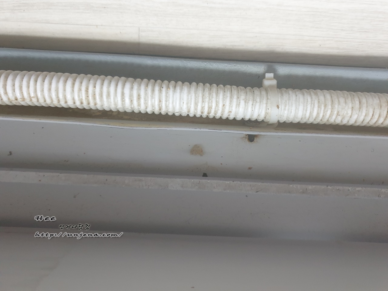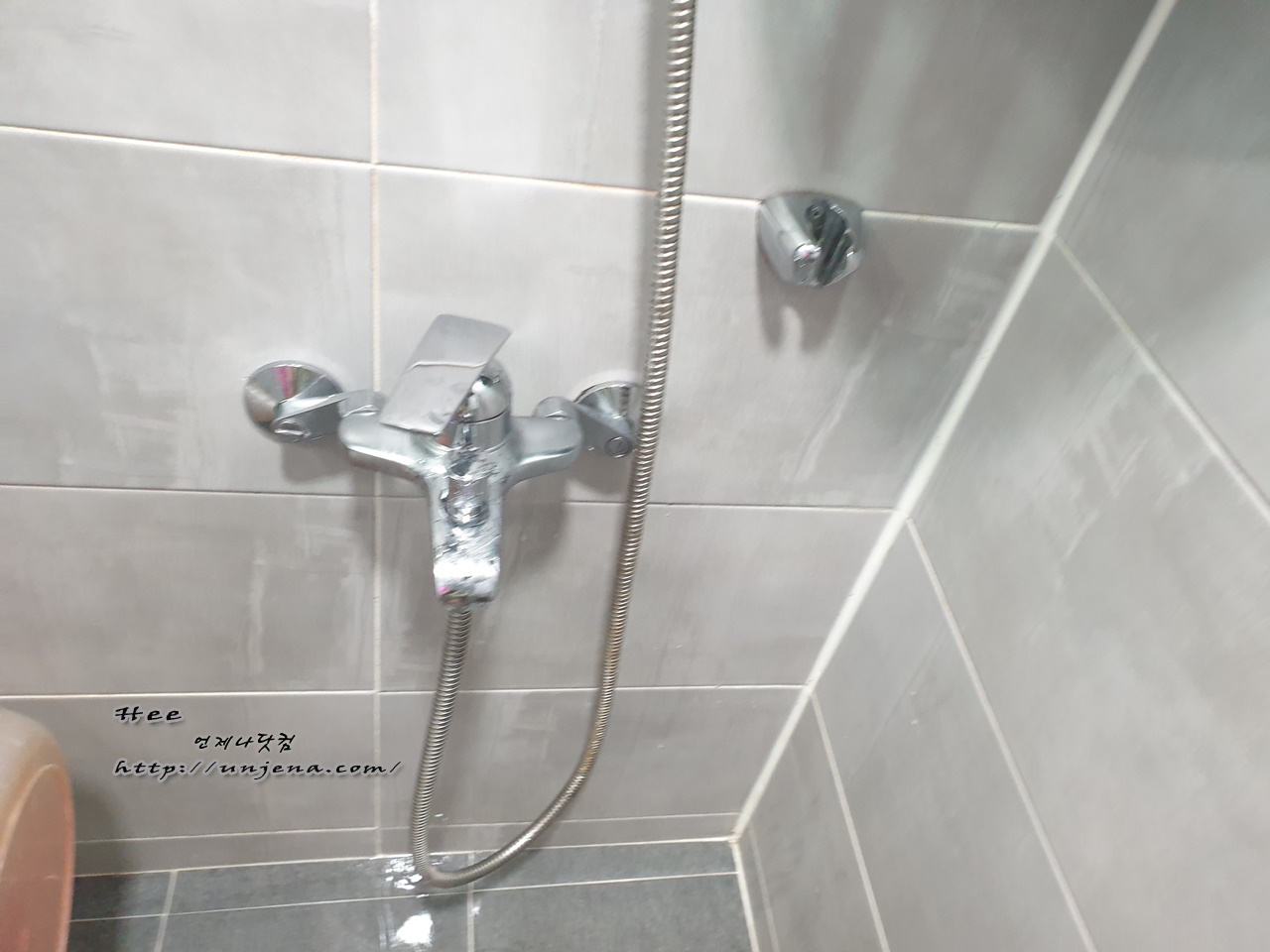 샤워기 호스도 딱 조명이 비치는 위쪽만 닦여 있고, 그늘진 곳은 때가 그대로 남아 있구요.