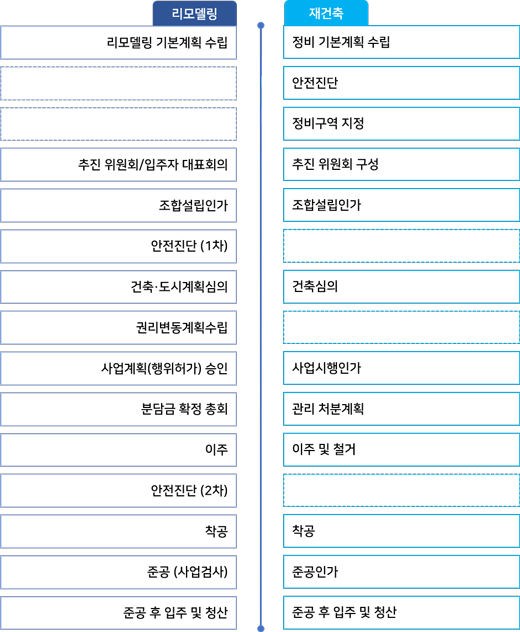 리모델링 진행절차를 재건축과 비교한 도표를 첨부합니다.