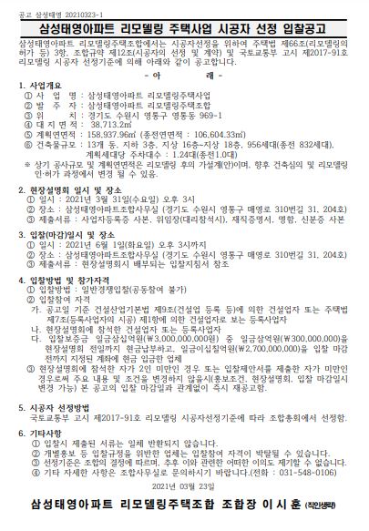 영통 삼성태영은 23일 시공자 선정 입찰공고를 게시하였는데요.