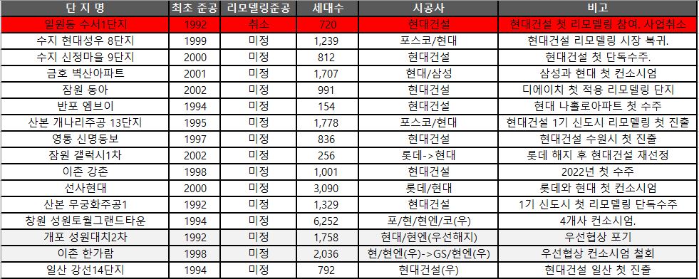 몇 개 단지가 더 시공사 선정되긴 했으나 모두 사업이 중단되었는데요.