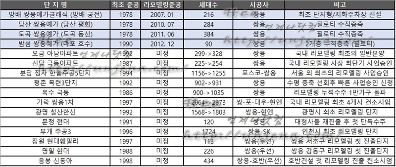초기 리모델링 준공 당시의 건설사들이 대체로 시범사업 경향을 보이는 데 반해,