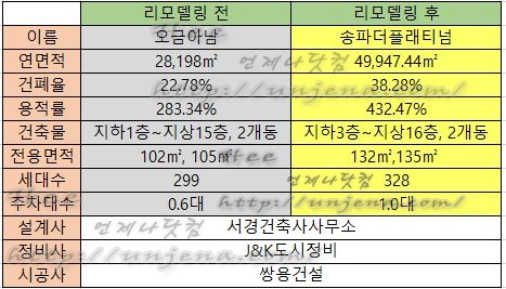 송파더플래티넘으로 재탄생하는 오금아남의 리모델링 전후 비교는 다음과 같습니다.