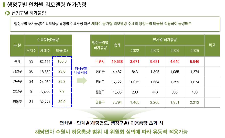 현재 장안구와 팔달구를 합쳐도 리모델링 조합이 0개이지만 30.8%의 허가총량을 차지하며,