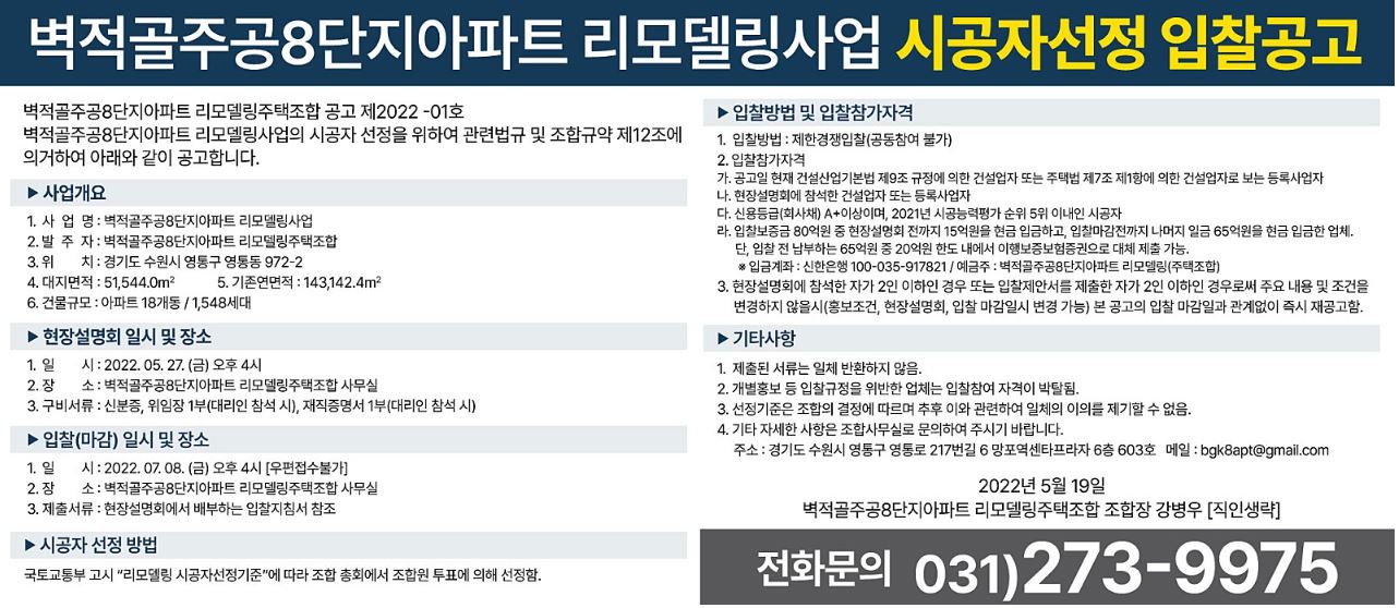 지난 19일 리모델링 사업 시공자선정 입찰공고를 게시하였습니다.