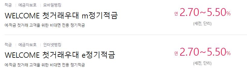 PC로 가입가능한 e정기적금과 모바일로 가입하는 m정기적금.