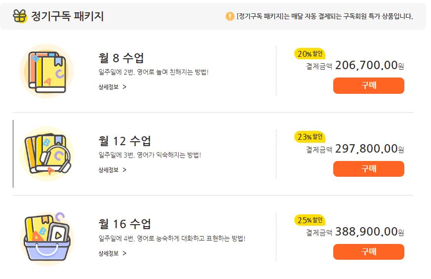 VIPKID 가격은 정기구독 형태로 매월 자동결제되는 패키지와,