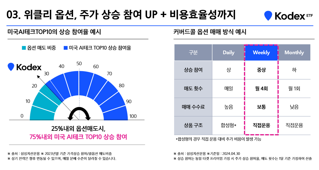 KODEX는 위클리 옵션을 통해 25% 내외의 옵션매도 전략을 취한다고 밝혔습니다.