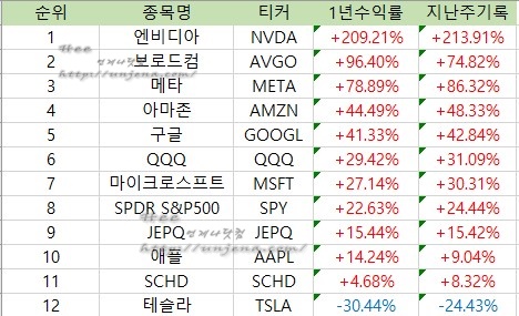2024년 24주차 종가 기준 1년 수익률 순위입니다.