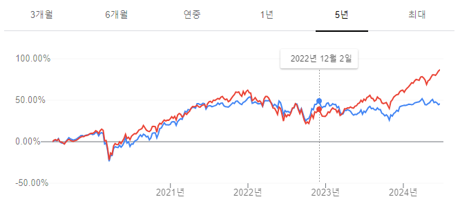 최근 5년간을 비교해도 SCHD는 2022년말~2023년초에 S&P500을 앞선 것을 제외하면,