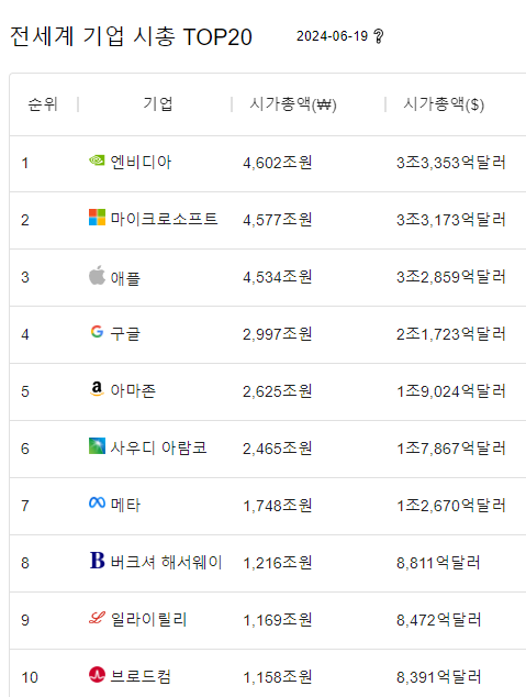 | 엔비디아 역대 3번째로 시총 3조 돌파하며 애플 제치고 시총 2위 등극. (1) | 2024.06.06 |