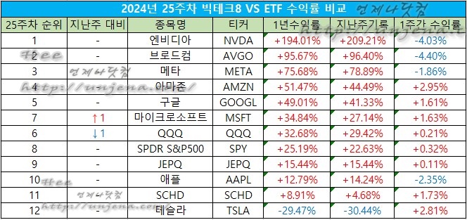 24년 25주차 매그니피센트7 vs 미국 대표 ETF 1년 수익률 비교 출전 리스트입니다.