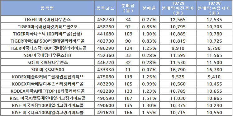 지난 10월 29일 장 마감 이후, 10월말 지급기준 국내상장 ETF들의 분배금 공시가 있었습니다.