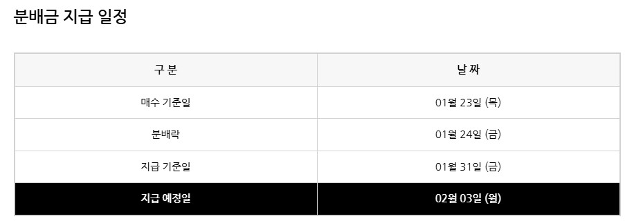 25년 1월말 배당지급 ETF들의 실제 지급일도 휴일 제외한 1영업일 뒤, 2월 3일 월요일입니다.