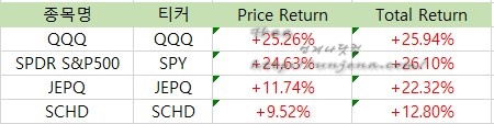 QQQ, SPY, JEPQ, SCHD의 2025년 1월 기준 최근 1년간 Total Return 수익률은 아래와 같습니다.