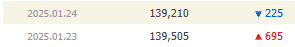 1월 24일은 225원 하락했는데 23일의 종가가 아닌 기준가격 139,435원에서 225원 하락한 139,210원으로 마감합니다.