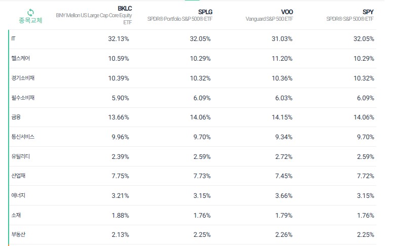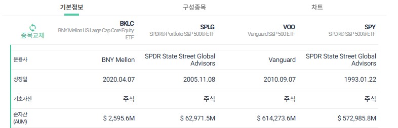BKLC는 S&P500 지수를 추종하는 대표 ETF들 VOO와 SPY 등과 99%이상 유사한 퍼포먼스와 포트폴리오를 지닌 ETF입니다.