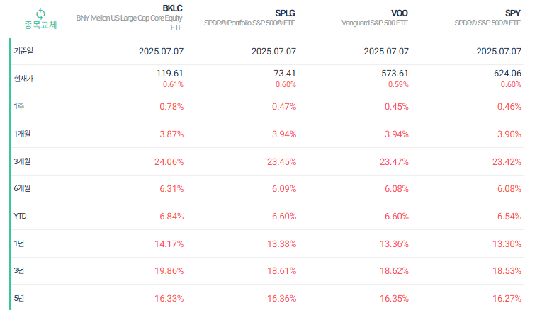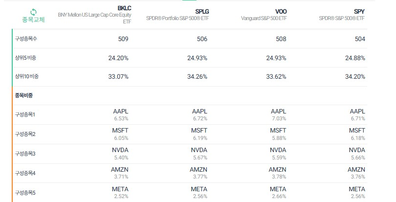 S&P500과 유사한 지수인 만큼 S&P500 지수를 추종하는 다른 ETF들과 비교를 해 보겠습니다.