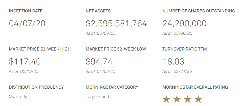 배당주기는 분기배당입니다. 펀드 평가로 유명한 모닝스타 카테고리는 Large Blend고 등급은 4개입니다.