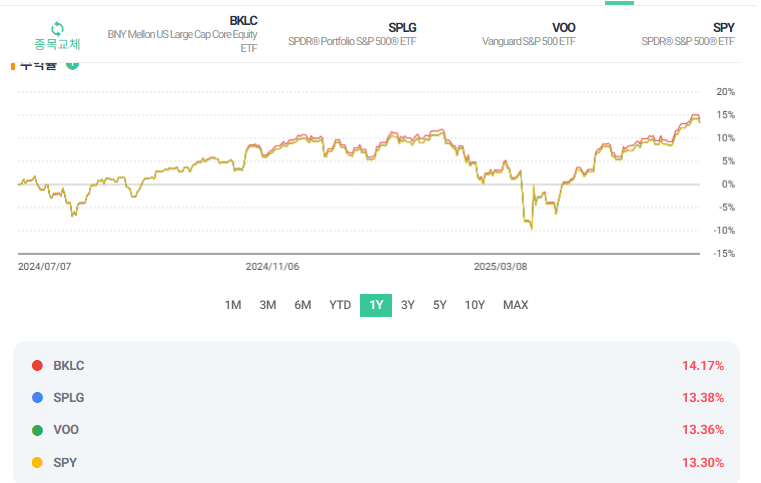 BKLC는 S&P500 지수를 추종하는 대표 ETF들 VOO와 SPY 등과 99%이상 유사한 퍼포먼스와 포트폴리오를 지닌 ETF입니다.