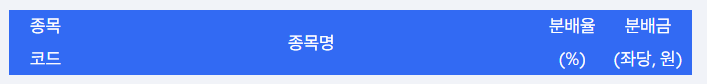 | 종목 | 종목코드 | 좌당 예상분배금(원) |