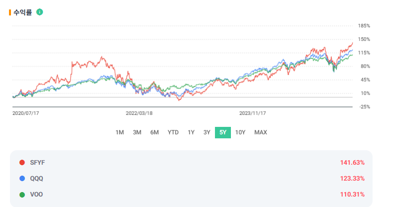 SFYF는 출시후 누적 수익률에서 S&P500을 초과하는 수익을 기록하고 있습니다.