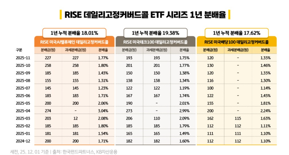 이처럼 나스닥100에서 RISE미국테크100데일리고정커버드콜이 보여준 모습이라면, 25년 12월 23일 상장하는 RISE미국S&P500데일리고정커버드콜 역시 좋은 모습을 보여줄 거라고 기대가 됩니다.