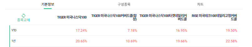 나스닥100 계열 ETF는 딱 1,2,3세대 커버드콜이 모두 출시되어 있어 앞서 설명한 커버드콜의 특징을 잘 볼 수 있습니다.