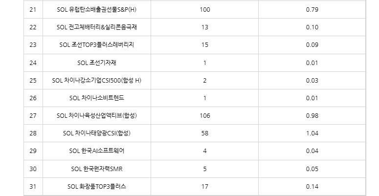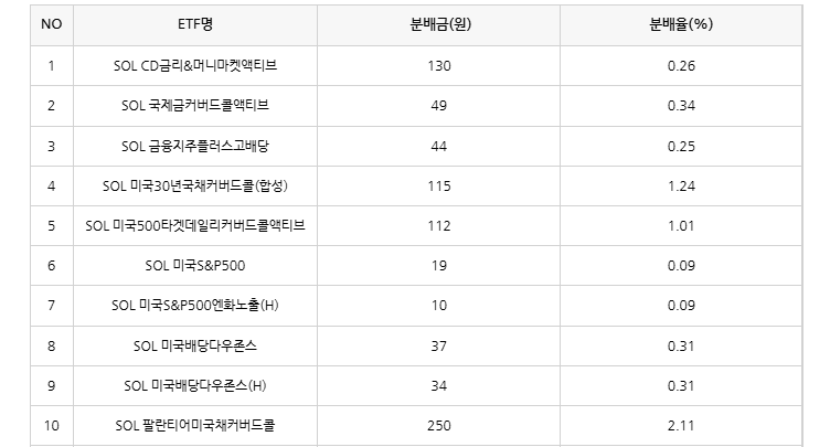 가장 분배금이 많은 ETF는 SOL 국고채10년의 3280원이며, 분배율 기준으로도 3.10%로 가장 높은 분배율을 기록했습니다.