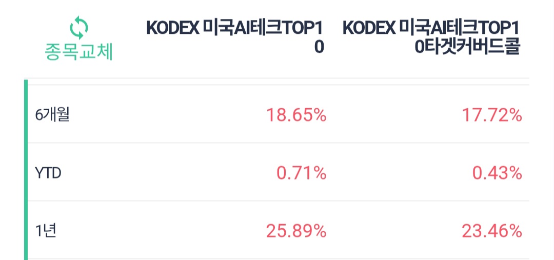 - 커버드콜이라 절대적인 주가 상승률은KODEX 미국AI테크TOP10보다 낮지만, 현금흐름이 주는 안정감.