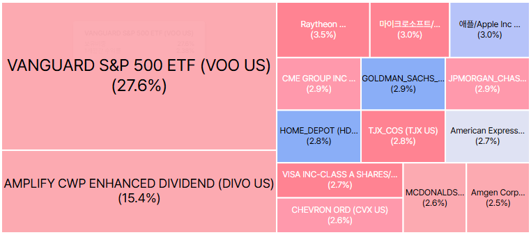 • 상장 초기엔 DIVO를 가장 높은 비중으로 구성했으나, S&P500으로 기초 지수를 변경하며 VOO가 가장 높은 비중으로 구성되어 있습니다.