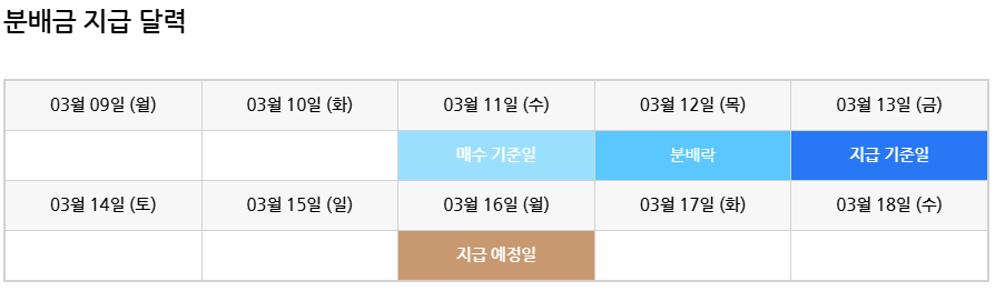 다만, 실제 지급일은 평일이라 올 3월 중순은 주말 휴일로 인해 분배락만 앞당겨진 효과를 받게 됩니다.