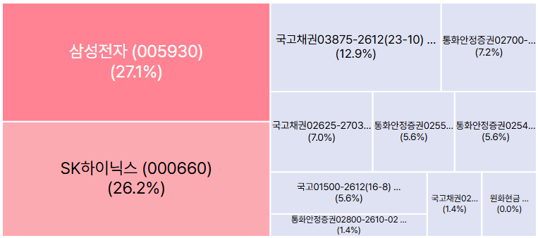 | 장점 | 삼성전자25%, SK하이닉스25%, 국고통안채50%에 투자하며, IRP계좌에서 최대 비중으로 반도체 투자 가능. |