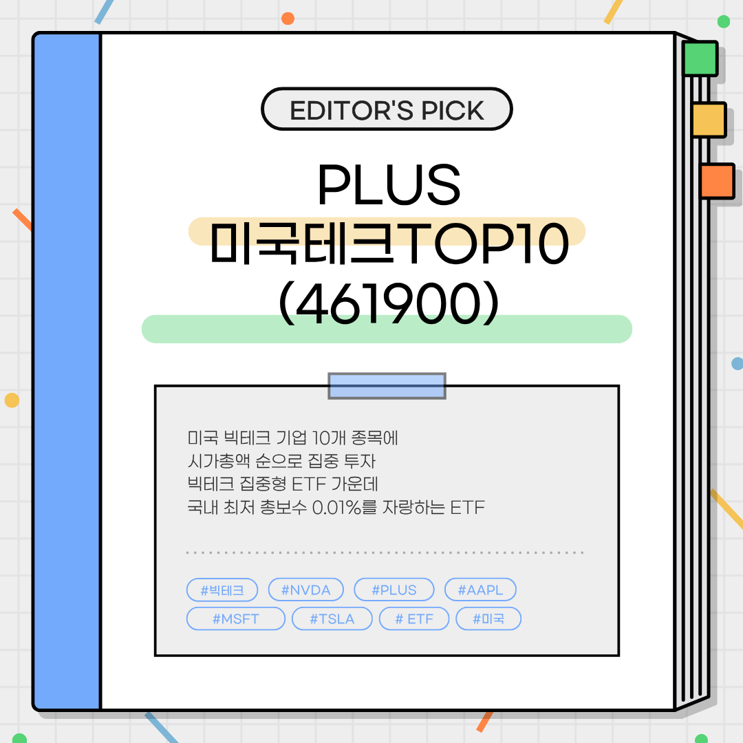 | PLUS 미국테크TOP10 | 461900 | 국내 최저 총보수의 빅테크 집중형 ETF | +10.36% / +6.36% / +63.61% |