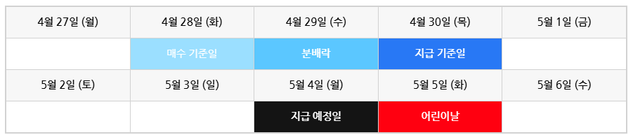 1주일 이후 5월 6일에서야 실제로 분배금이 지급됩니다.