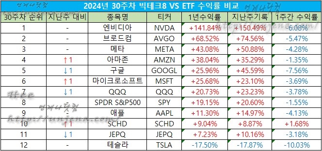 24년 30주차 매그니피센트7 vs 미국 대표 ETF 1년 수익률 비교 (24.07.29.)