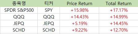 배당률이 낮은 QQQ의 경우는 Price Return과 큰 차이가 없지만, SPY-SCHD-JEPQ 순으로 배당률이 올라갈수록 주가수익률과 총수익률의 차이가 눈에 띄는 것을 알 수 있습니다.