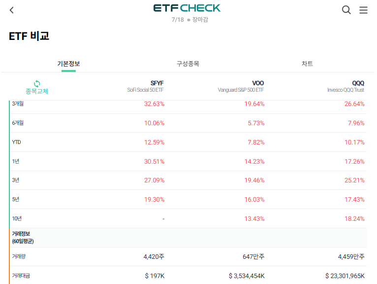 국내의 유사 ETF인 KODEX 미국서학개미등의 경우는 외탁결제원을 통한 국내 투자자 전체의 투자현황을 알 수 있지만, SFYF는 SoFi 플랫폼의 투자자만의 현황으로 산출됩니다. 따라서 SoFi Invest 플랫폼을 이용하지 않는 투자자들을 포함했을 때와는 다소 차이가 있는 구성종목이 될 가능성이 있습니다.