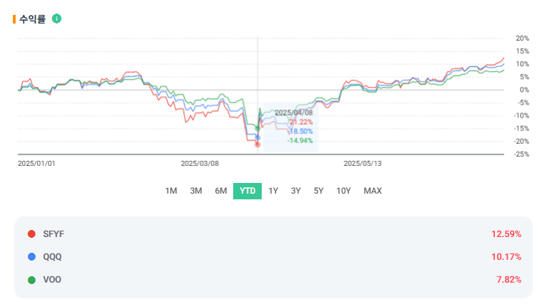 SFYF는 출시후 누적 수익률에서 S&P500을 초과하는 수익을 기록하고 있습니다.