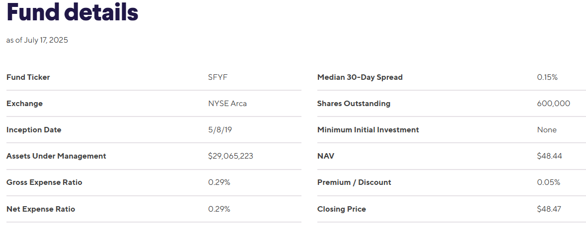 따라서 SFYF ETF는 일반적인 시장 지수를 추종하는 ETF들과는 달리, 추종 지수가 별도로 없습니다.