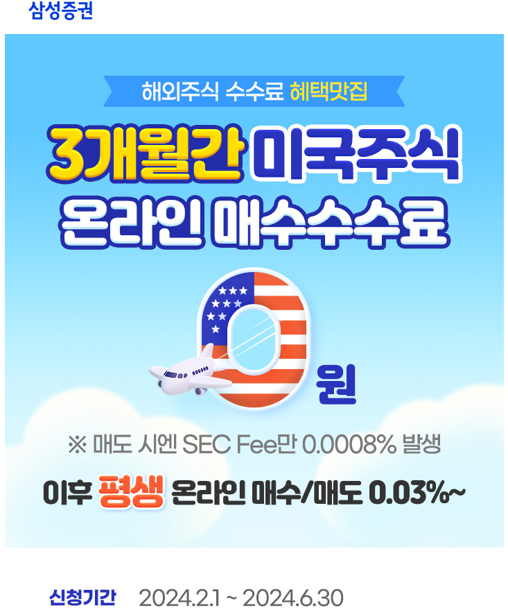 삼성증권은 지난 2024년 2월1일부터 24년 6월30일까지 신규/휴면고객을 대상으로 3개월간 매수수수료 무료.